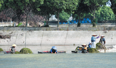湖南省益阳市,工人在大通湖水生植物产业示范园内采收水草。大通湖地处洞庭湖腹地,近年来,当地已完成湖内水生植被修复五期工程,面积达6.7万亩。