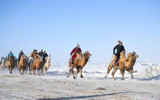 12月17日,选手在内蒙古自治区第二十届冰雪那达慕赛骆驼比赛中。新华社记者贝赫 摄